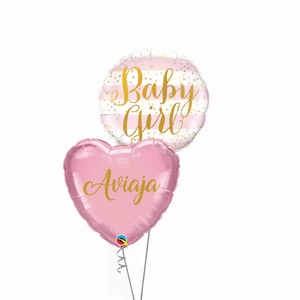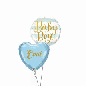 Send en sød hilsen til barnedåben eller de nybagte forældre med denne ballonbuket. Ballonbuketten indeholder en baby ballon med teksten "baby girl" eller "baby boy", samt en matchende hjerte ballon med navn i guld.